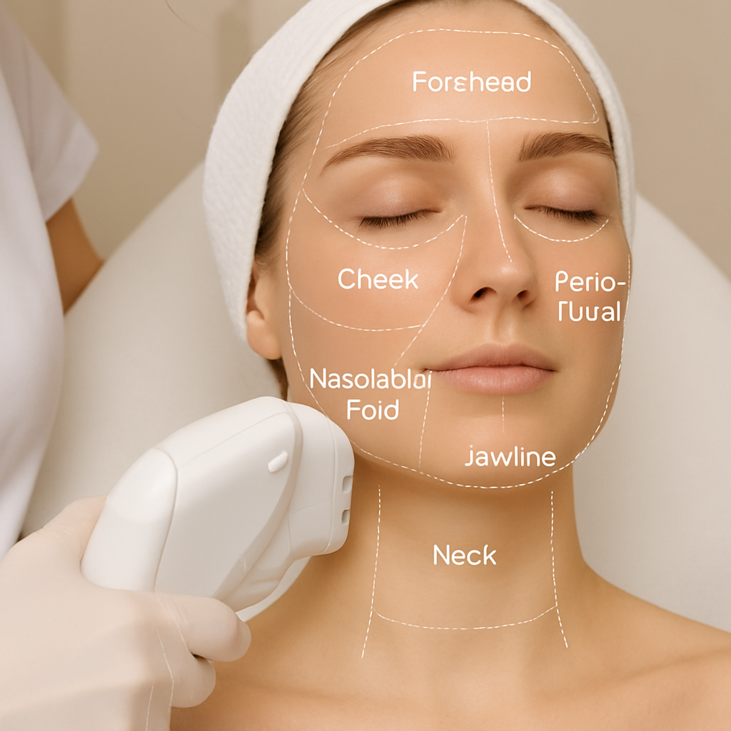 HIFU is geschikt voor het behandelen van verschillende zones, zoals het gezicht, de kaaklijn, hals en decolleté.